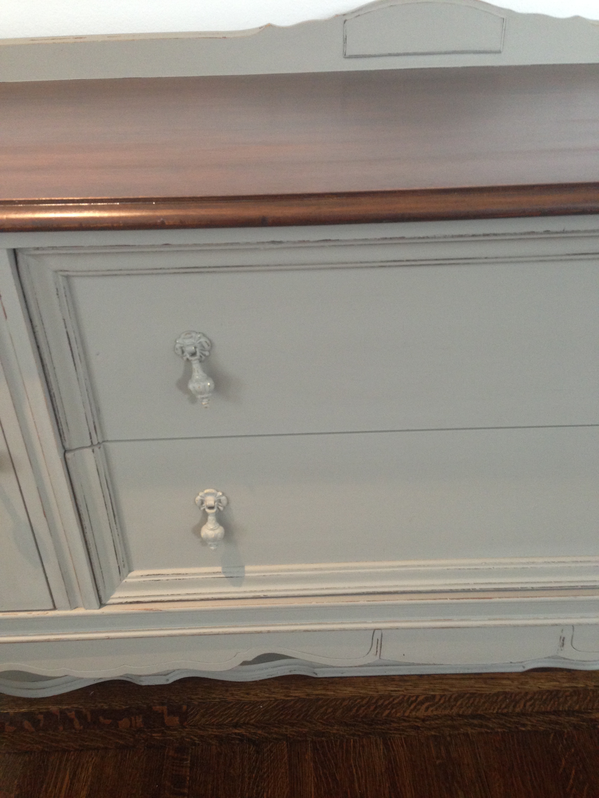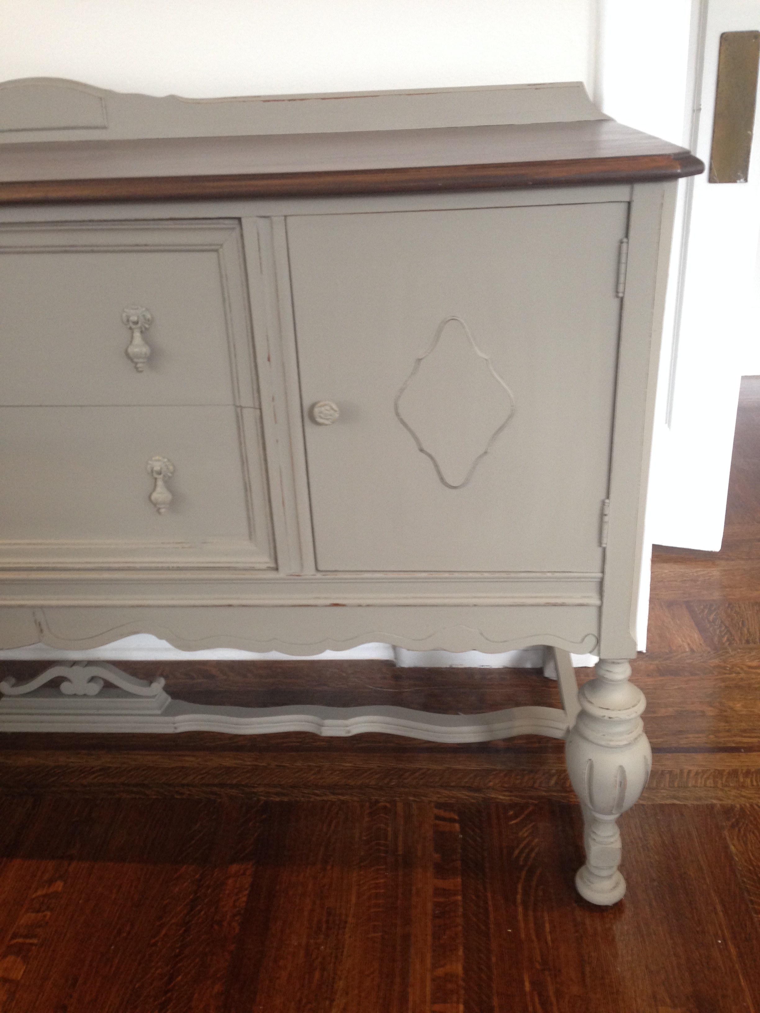 This antique beauty was refinished in refinished in French Linen (Annie Sloan Chalk Paint) and wax coated for durability. Top was stripped and stained in dark walnut then triple coated with poly. Two drawers and two cupboards, all original antique pulls.