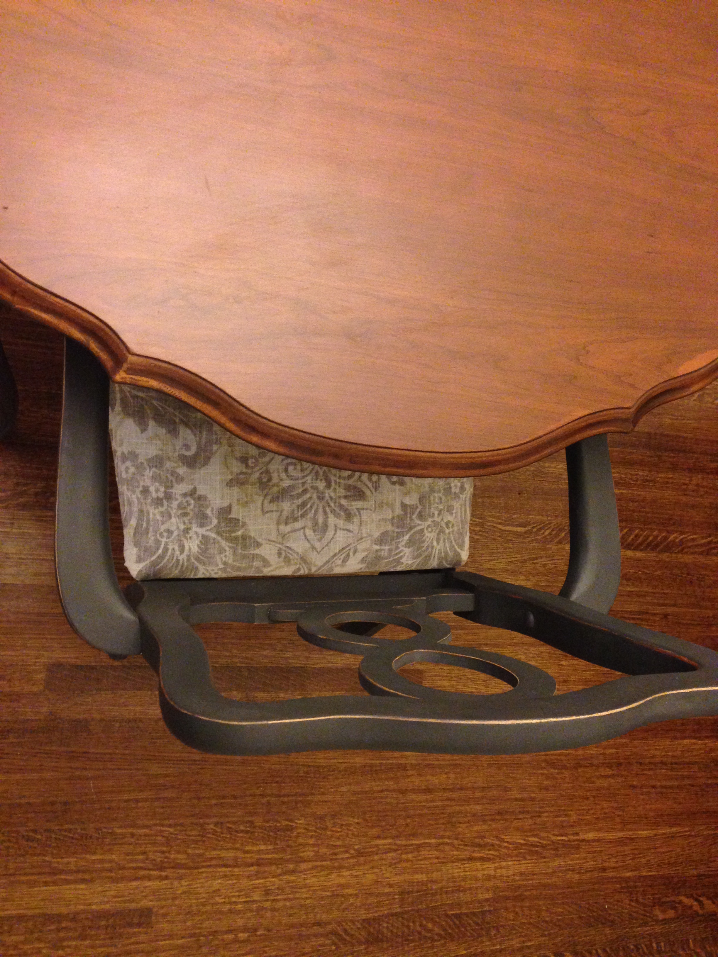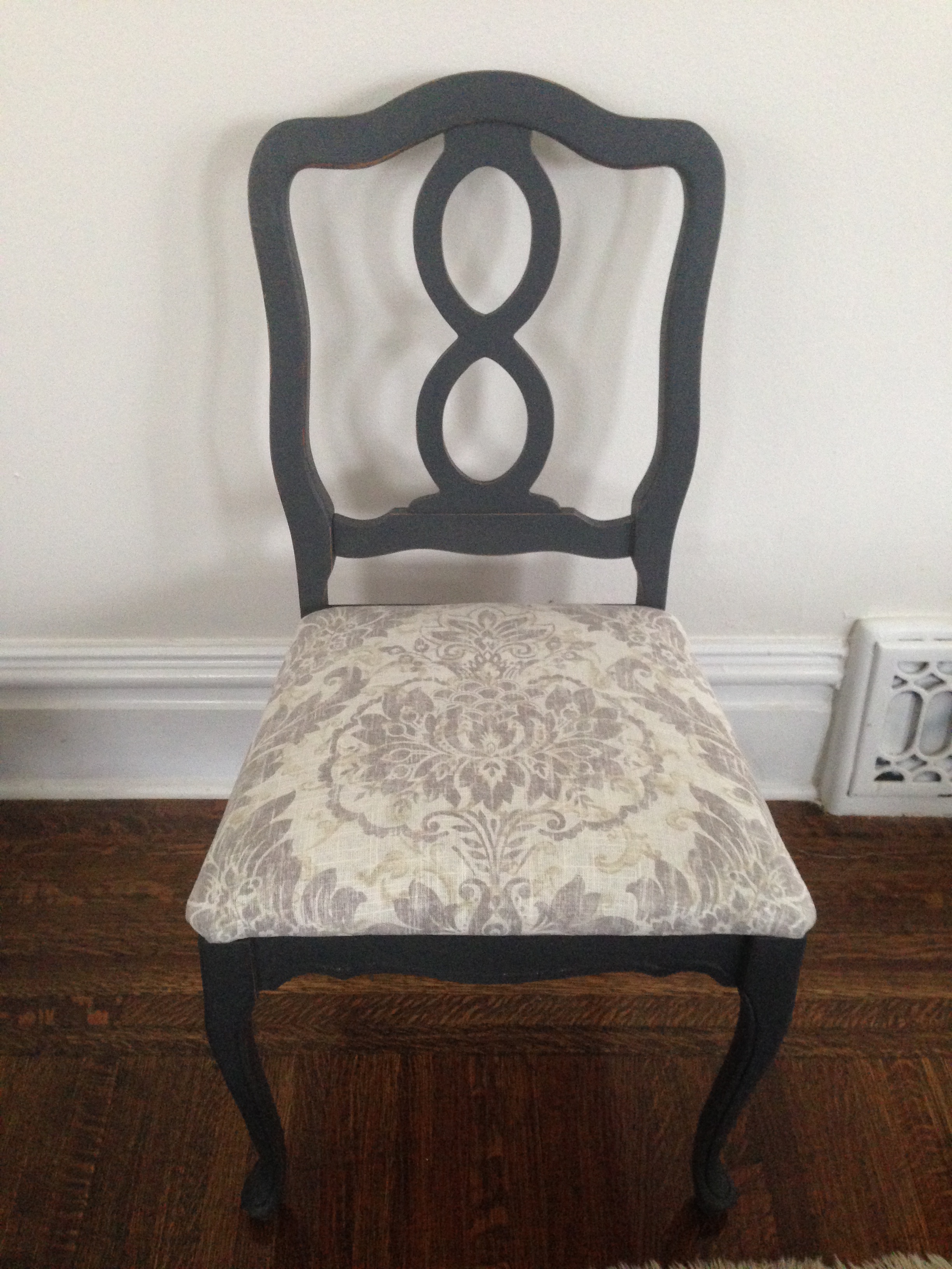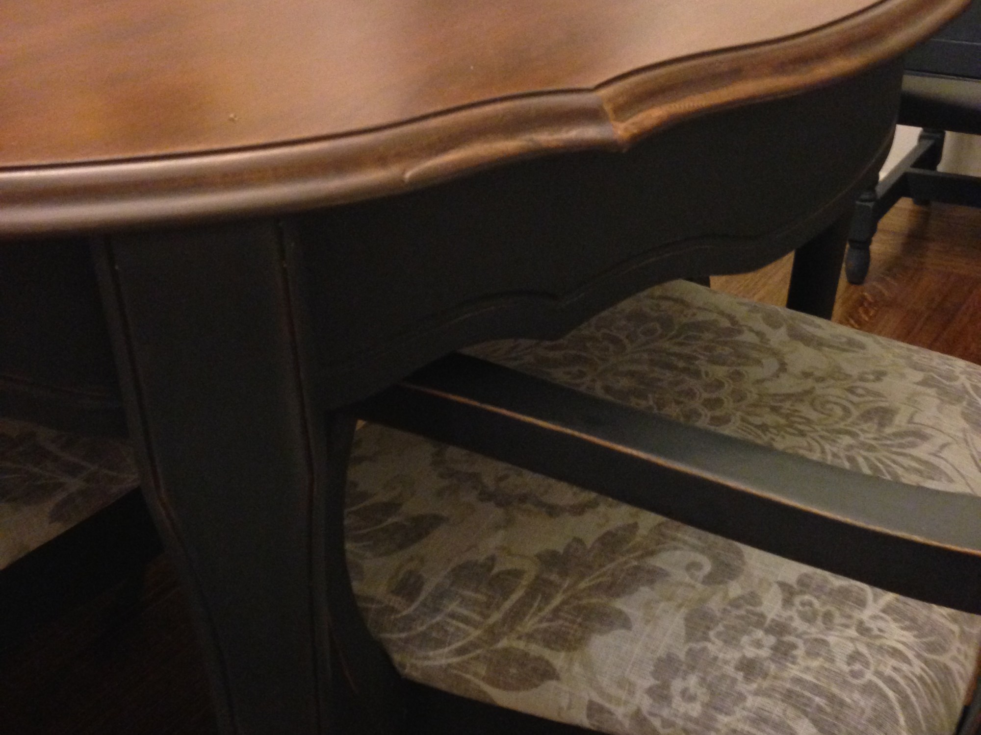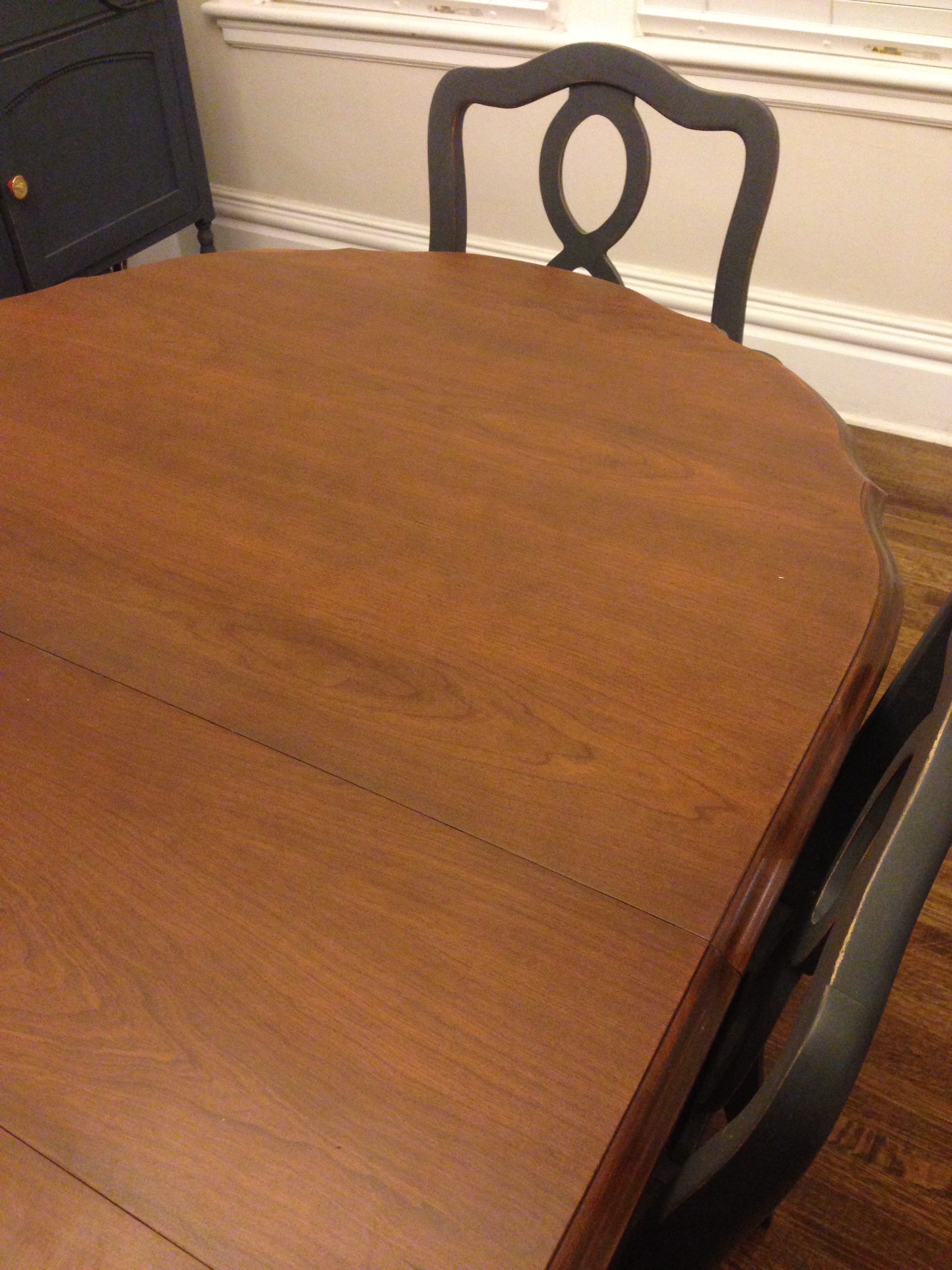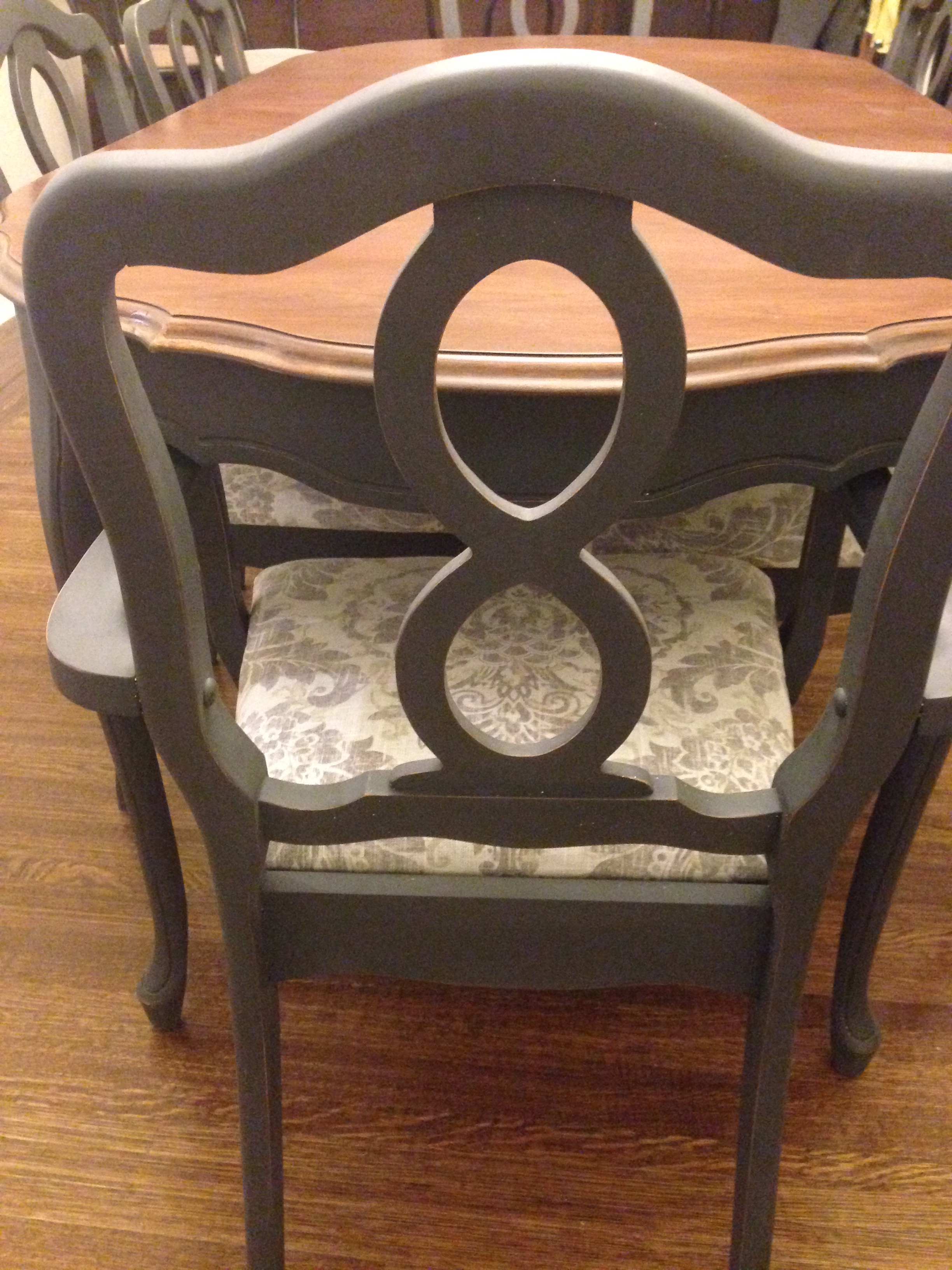 Top of table has been refinished in a dark walnut then triple coated with poly for a durable finish. Base of table and chairs have been refinished in Annie Sloan Graphite and wax coated. Chairs are freshly reupholstered.